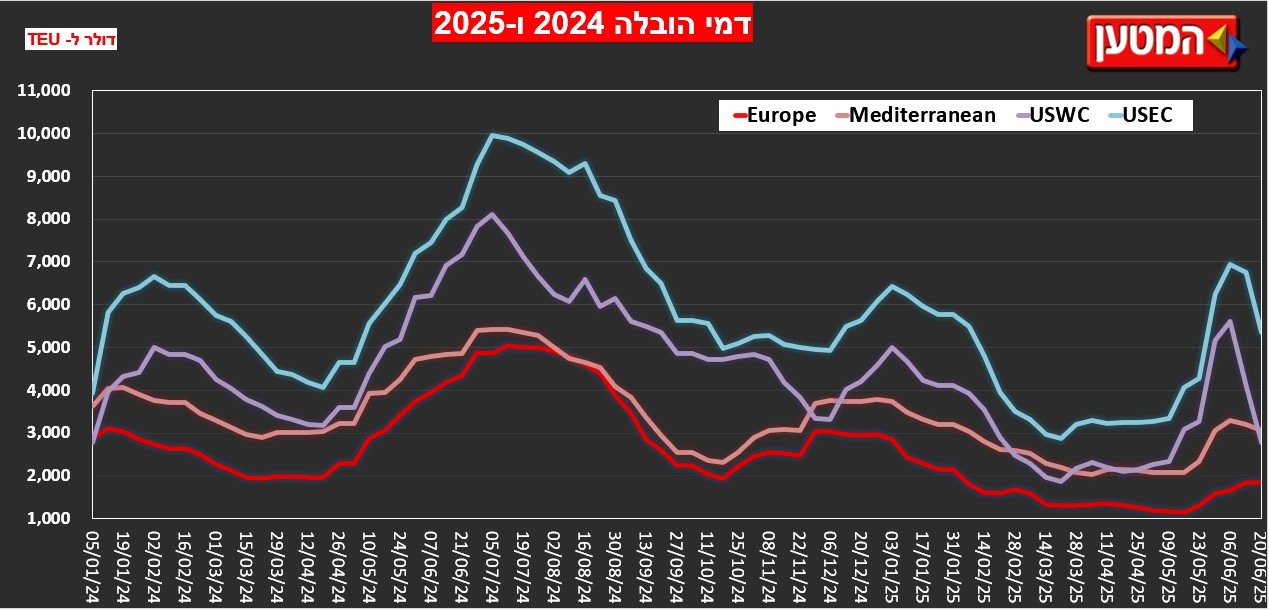שבועיים קשים עברו על דמי ההובלה בסחר מאסיה לנמלי החוף המערבי של ארה"ב ושבוע קשה בסחר מאסיה לנמלי החוף המזרחי של ארה"ב שם דמי ההובלה ירדו ב-13%.